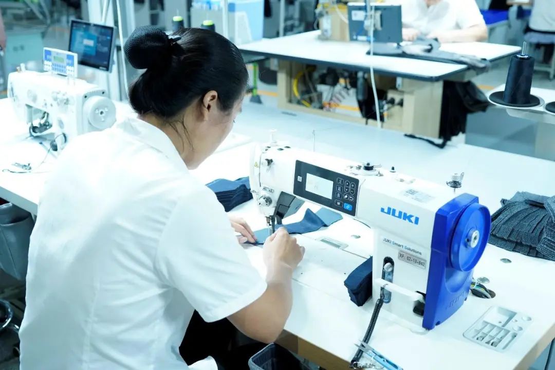 雅戈爾服裝生產車間,通過自動分配生產,可顯著減少配對的時間成本,單工位生產效率提高25%