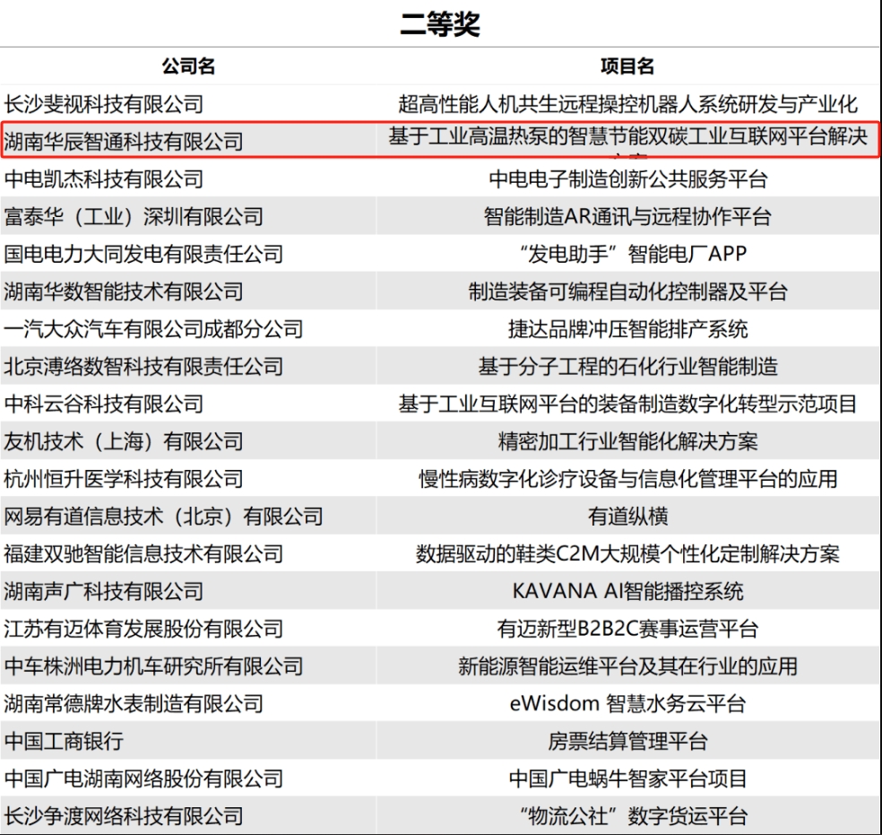 湖南華辰智通科技有限公司(以下簡稱“華辰智通”)的基于工業高溫熱泵的智慧節能雙碳工業互聯網平臺解決方案榮獲全國二等獎。同時,該解決方案還入選2023開源和信息消費大賽百佳項目。
