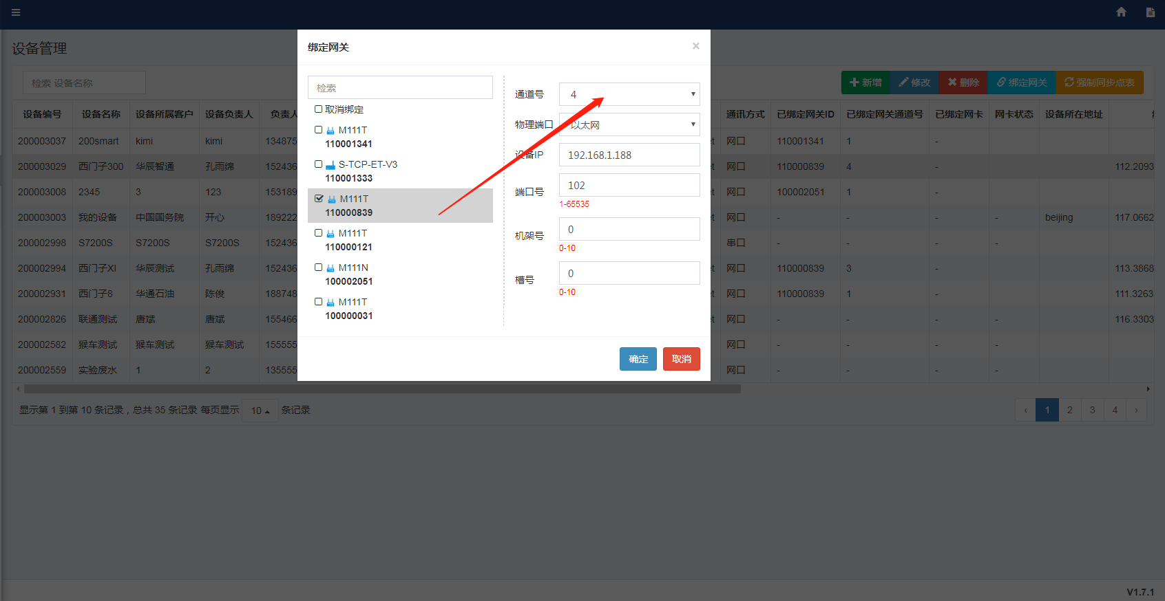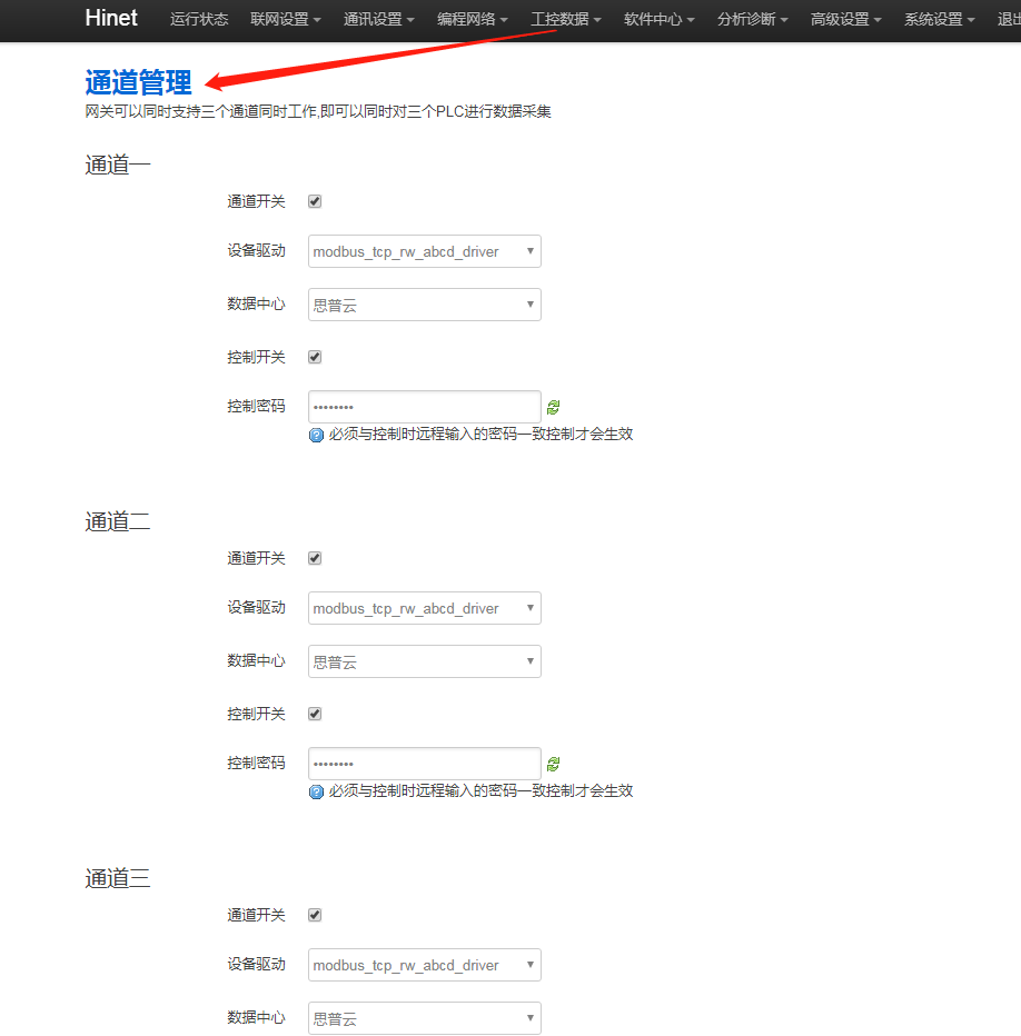 2. 后臺通道與平臺上所選通道不一致,網關后臺“工控數據 - 通道管理”打開的是通道1,思普云平臺設備管理處,設備綁定網關時通道選擇1。