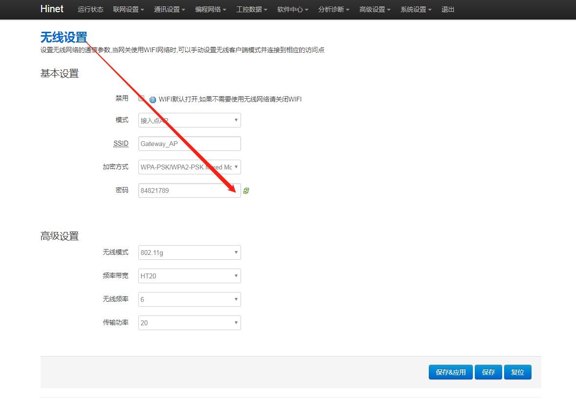 2.WIFI密碼是否正確,進網關后臺,點擊“通訊設置 - 無線設置”,點擊顯示密碼圖標,確認密碼。
