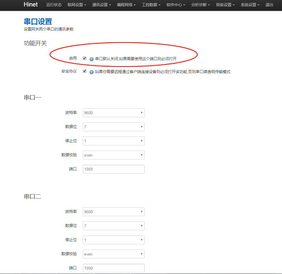 1. 網關串口功能是否開啟,進網關后臺,點擊“通訊設置 - 串口設置”,串口勾選【啟用】。